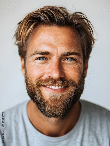 A handsome man with blond hair and a full beard smiles warmly at the camera in a close-up portrait.