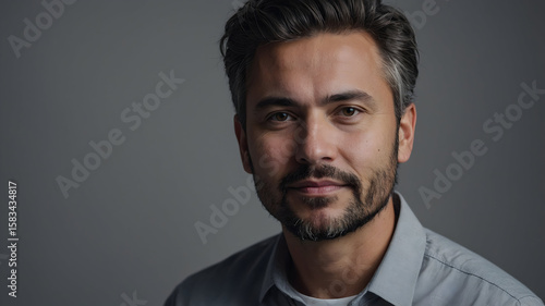 A handsome mature man with gray hair and a beard poses for a portrait in a studio setting with a casual shirt.