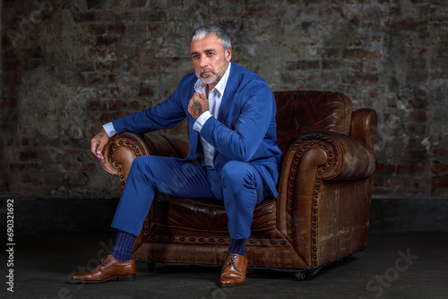 A handsome middle-aged man in a blue formal suit poses sitting on a leather armchair. Portrait of a businessman. A handsome middle-aged man poses on a brick background with a place to copy