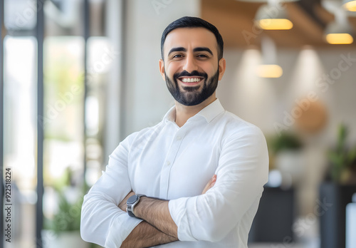A handsome, smiling Arabic businessman wearing a white shirt, standing in an office, looking at the camera with his arms crossed.