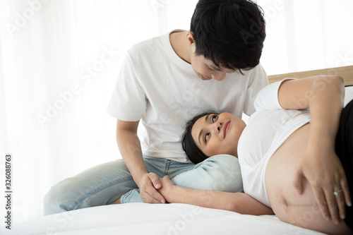 A handsome young husband and a beautiful wife, who are pregnant for about 6 months. He takes care of her closely with love and cherish, with hugs and gentle touch. Being maternity and parenthood.