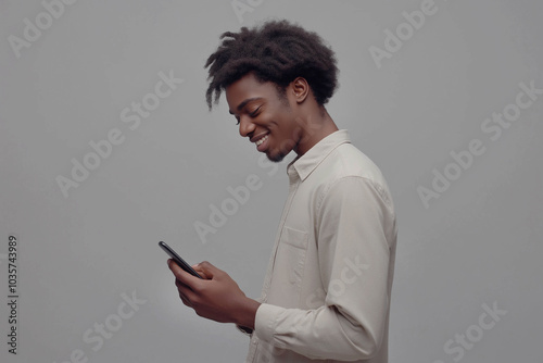 A handsome young man of African-American appearance in a light shirt on a light background. The man looks at the phone. Advertising banner.