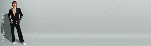 A handsome young man stands confidently, wearing a sleek black suit and striking accessories.