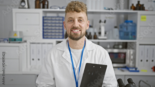 A handsome young man with blue eyes and a beard, wearing a lab coat and lanyard, holding a clipboard in a laboratory setting.