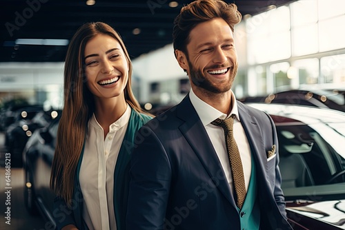A happy and professional couple at a dealership, working together with teamwork and joy in an urban setting.