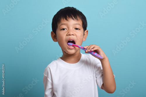 A happy Asian boy with clean teeth brushing his teeth isolated on blue background. Children's dental hygiene, Medical care