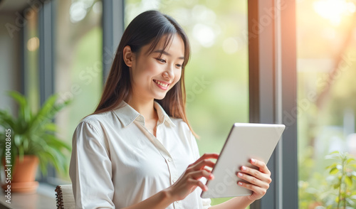 A happy Asian woman is typing on a tablet outside