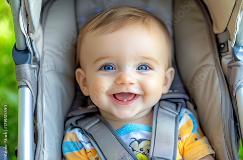 A happy baby boy wearing colorful is sitting in the stroller outdoors, smiling and waving his hand. The focus is on him with his blue eyes