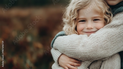 A happy blonde-haired child grins delightfully while being warmly embraced, set in a natural outdoor environment with a touch of autumn in the air.