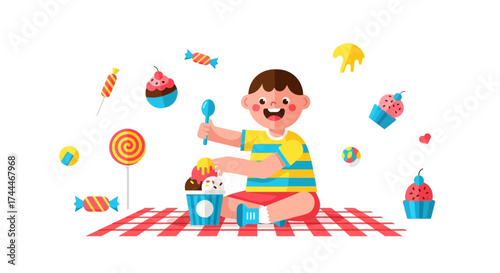 A happy child enjoying ice cream and sweets treats in an illustrative and colorful design