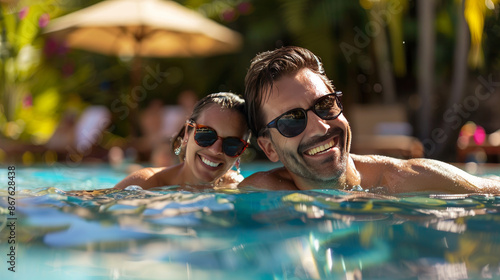 A happy couple enjoys a refreshing dip in a resort pool during their summer vacation.