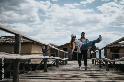 A happy couple shares a carefree, joyful moment as they walk along a wooden pier during their vacation, embodying the spirit of adventure and relaxation.