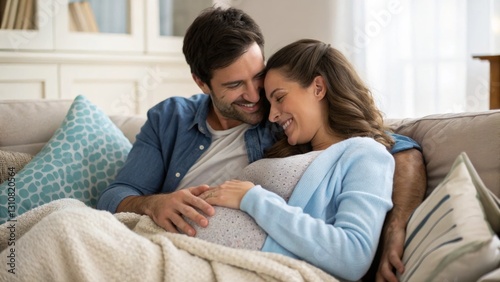 A happy couple shares a tender moment on the couch, embracing and celebrating their upcoming parenthood together.