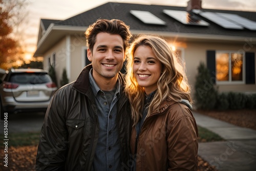 A happy couple stands smiling in the driveway of a large house with solar panels installed in late autumn sunset with sunflares in the background. Generative ai.