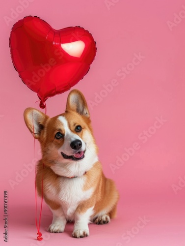 A happy dog holding a bright red heart-shaped balloon, great for Valentine's Day or any day you want to spread love and joy