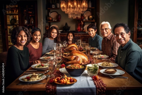 A Happy Family Christmas or Thanksgiving Dinner with Roasted Turkey