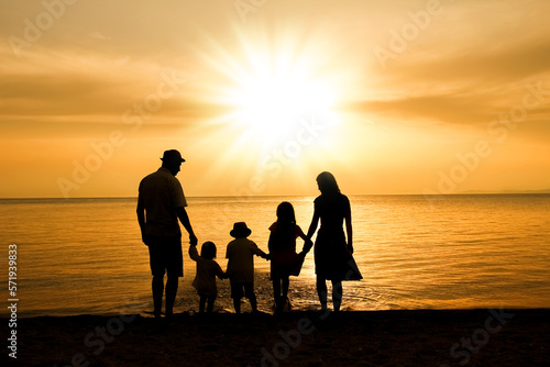 A happy family in nature by the sea on a trip silhouette