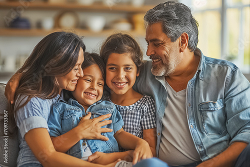 A happy family with two kids embracing in a warm group hug, conveying love and togetherness in a casual home setting