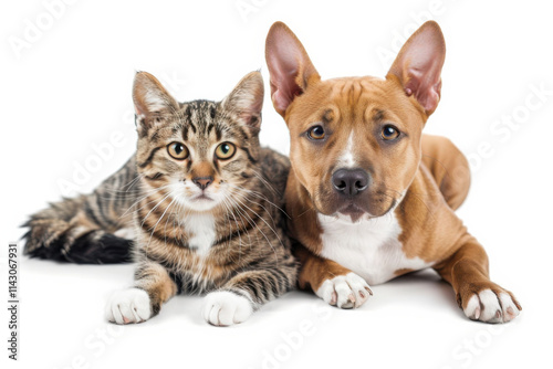 A happy German Shepherd dog and a tabby cat lying together, both looking directly at the camera.