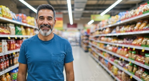 a happy man looking to the camera, in the middle of a supermarket aisle