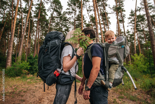A happy married couple in love on a hike with a child in a travel backpack. laugh, smile and kiss