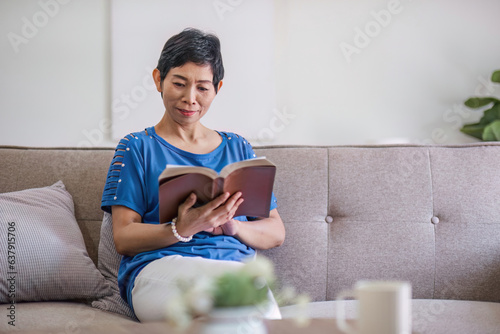 A happy retired 60s Asian woman reading a book while having her coffee on a sofa at home.