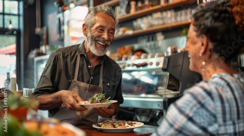 A happy senior man, smiling warmly, serving food to a woman at a cozy cafe, creating a moment of joy and connection as they enjoy a casual meal together.