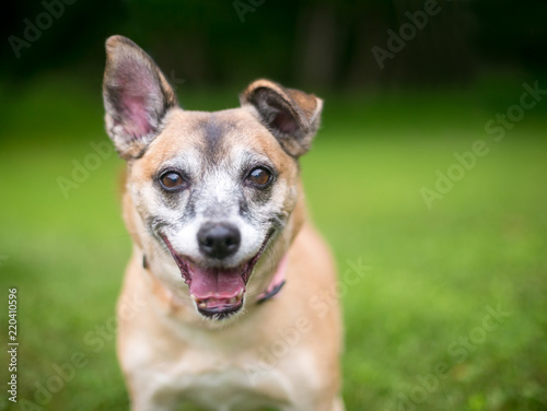 A happy Terrier mixed breed dog with one straight ear and one folded ear
