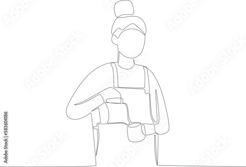 A happy woman pouring coffee for a customer. Coffee shop activity one line drawing