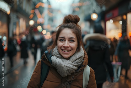 a happy woman traveler, walking towards the camera in a crowded street. generative AI