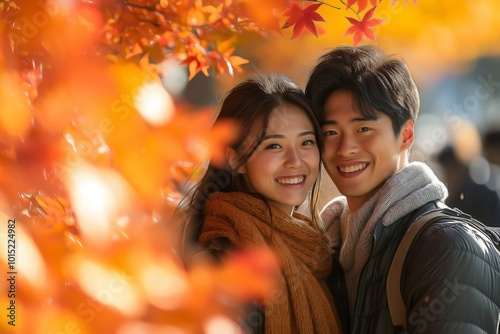 A happy young Asian couple enjoying an autumn day, surrounded by the vibrant colors of falling maple leaves.
