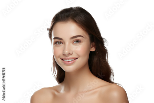 A happy young woman with healthy skin showing skincare isolated on transparent background.