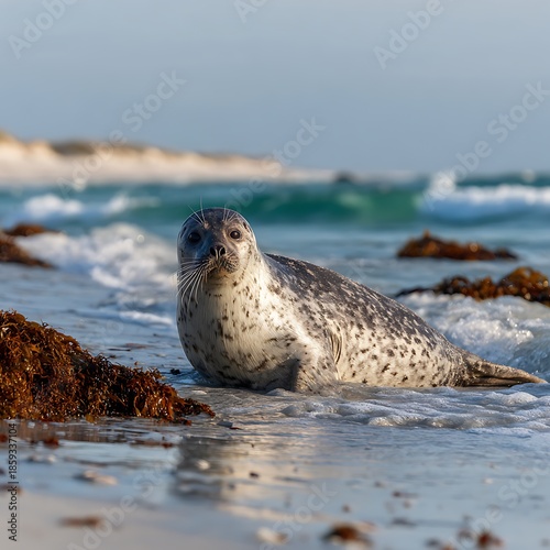 A harbor seal rests on the sandy shore, waves lapping at the edge, under a bright sky