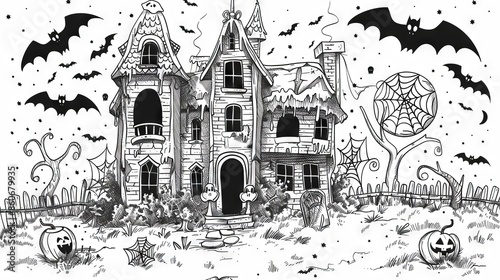 A haunted house with bats and ghosts.