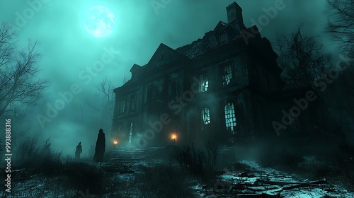 A haunted manor on a misty night, the moon casting eerie shadows on broken windows, where flickering candlelight illuminates the faint silhouettes of shadowy figures. Gothic horror scene, eerie,