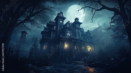 A haunted mansion with broken windows and ghostly apparitions in the mist - Generative ai