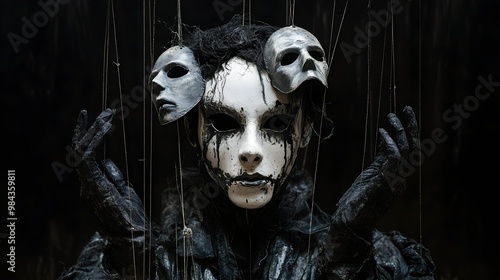 A haunted marionette with broken strings, adorned with creepy Halloween masks, gothic horror illustration, isolated on white background