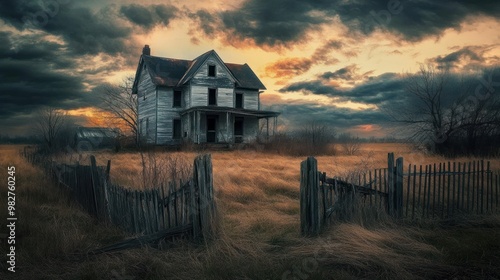 A haunting, abandoned farmhouse surrounded by overgrown grass under a dramatic sky.