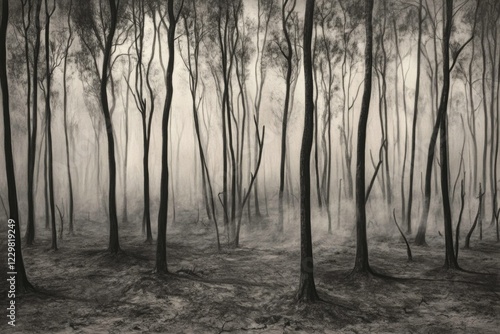 A haunting, black and white depiction of a foggy forest, featuring tall, slender trees with barren branches, creating a mysterious atmosphere evocative of solitude and nature