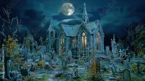 A haunting graveyard scene featuring a gothic church under a full moon.