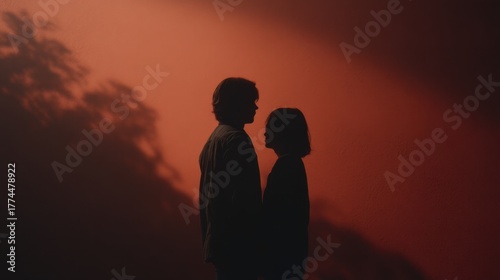 A Haunting Halloween Scene Featuring Lovers Leaning Close Under Eerie Shadows With a Deep Red Backdrop Creating an Atmospheric Mood