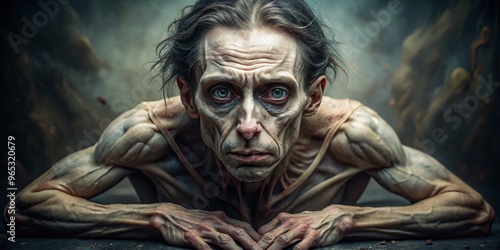 A haunting portrait of a person with severe physical abnormalities, distorted facial features, and twisted limbs,