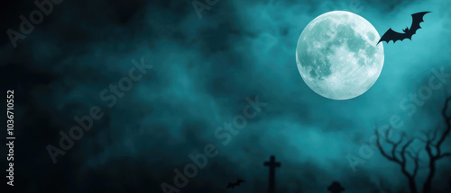 A haunting scene featuring a full moon surrounded by dark, misty clouds, with a bat flying above a spooky silhouette of trees and gravestones.