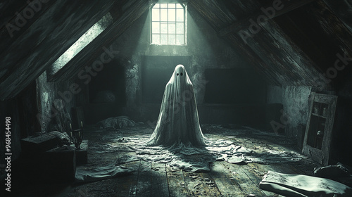A haunting scene in an attic with a ghostly figure shrouded in white, illuminated by soft, eerie light through the window.
