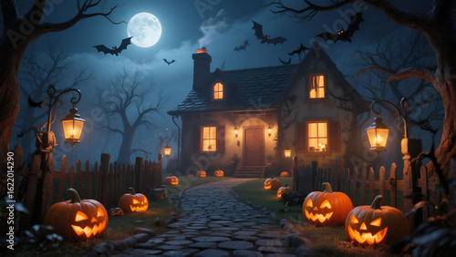 A hauntingly Halloween scene featuring a charming, old-fashioned house with warm, glowing lights. Halloween, Halloween Costumes, Halloween Background, Happy Halloween