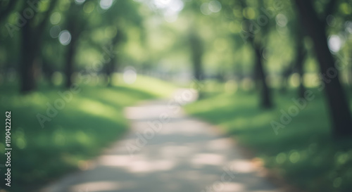 A hazy depiction of a meandering pathway within a park, encircled by lush, green foliage
