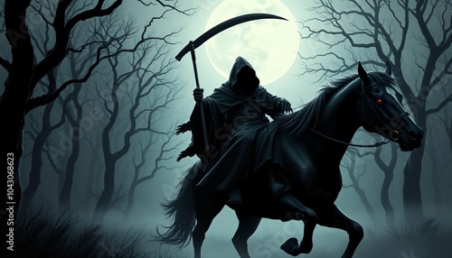 A headless horseman riding through the night, his flaming pumpkin head held high as he gallops through a foggy forest