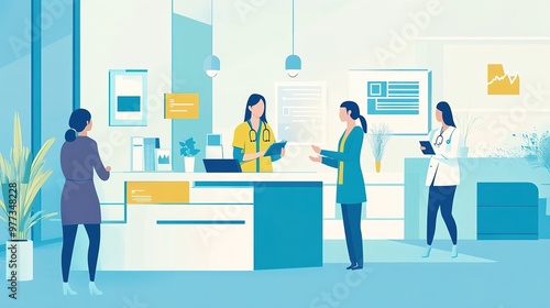 A healthcare insurance company office, with a representative assisting a client in selecting the best insurance plan, with branding elements in the background.