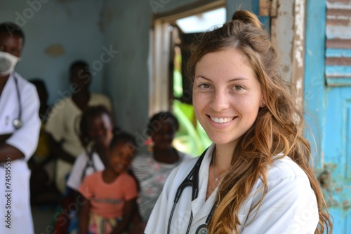 A healthcare professional, identified as a woman with a stethoscope, stands in front of a group of people, likely discussing global health outreach initiatives and strategies