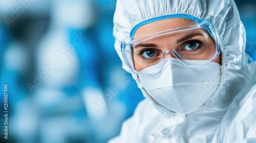 A healthcare professional wearing a protective suit, mask, and goggles looks directly at the camera while working in a laboratory, highlighting dedication during challenging times